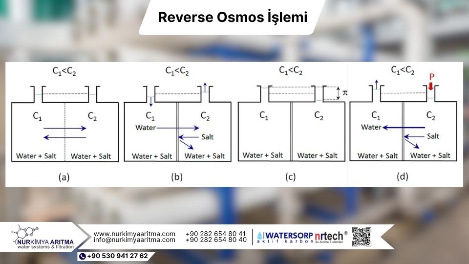 Ozmoz, doğadaki dengeleme prensibidir; seyreltik → yoğun tarafa kendiliğinden akış vardır. Ters Ozmoz ise bu akışı durdurmak için gereken ozmotik basınca ek olarak uygulanan harici basınçla çalışır. Bu basınç, membran yüzeyinde 7 bar (acı su) ile 70 bar (deniz suyu) arasında değişebilir.